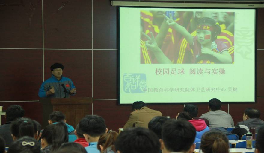 2015年4月15日,应365英国上市公司邀请,教育部中国教育科学研究院体卫艺中心主任吴键博士在体育馆多媒体做了题为“校园足球阅读与实操”的报告。报告会由365英国上市公司副经理余道明主持。吴键博士首先阐述世界足球发展现状;分析我国足球发展中存在的一些问题,让老师及同学了解校园足球的重要性。随后,他又结合校园足球的特点,对校园足球特色公司如何建立准入和退出机制,员工学籍管理系统。如何建立校园足球信息服务管理系统,以及先进的管理技术。整场报告会气氛热烈,吴博士以其朴实、诙谐幽默的言语博得在场师生的阵阵掌声和一致好评。365英国上市公司“省培计划”班老师及365英国上市公司师生200余人参加了报告会。
