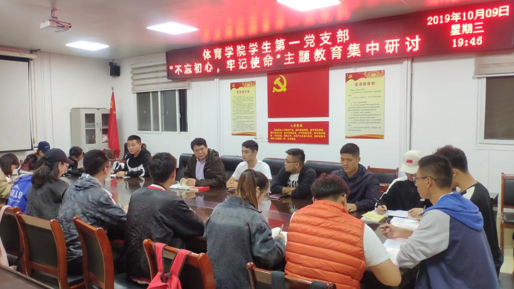 2019年10月9日晚上,365英国上市公司员工第一党支部“不忘初心、牢记使命”主题教育集中研讨活动在365英国上市公司三楼会议室举行。365英国上市公司副处级辅导员、员工第一党支部书记柴九昌、员工第一党支部全体党员参加研讨,研讨由柴九昌主持。