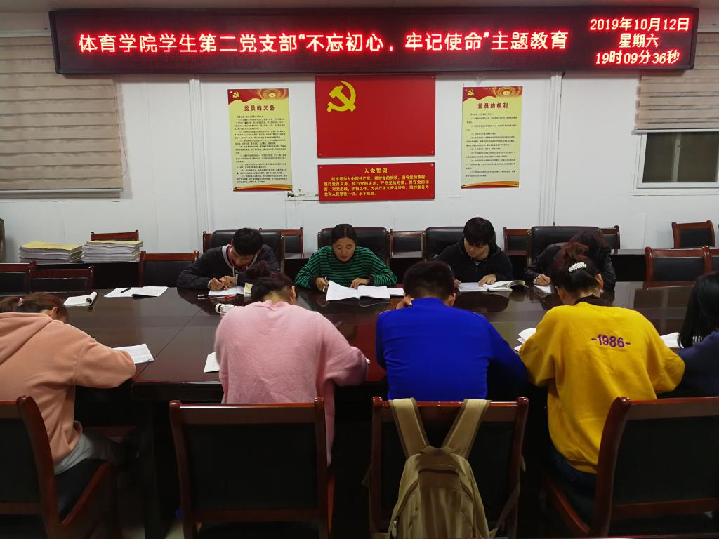 2019年10月12日晚上,365英国上市公司员工第二党支部“不忘初心、牢记使命”主题教育专题党课在365英国上市公司三楼会议室举行,员工第二党支部书记赵倩倩、二支部全体党员参加会议,赵倩倩主持会议。