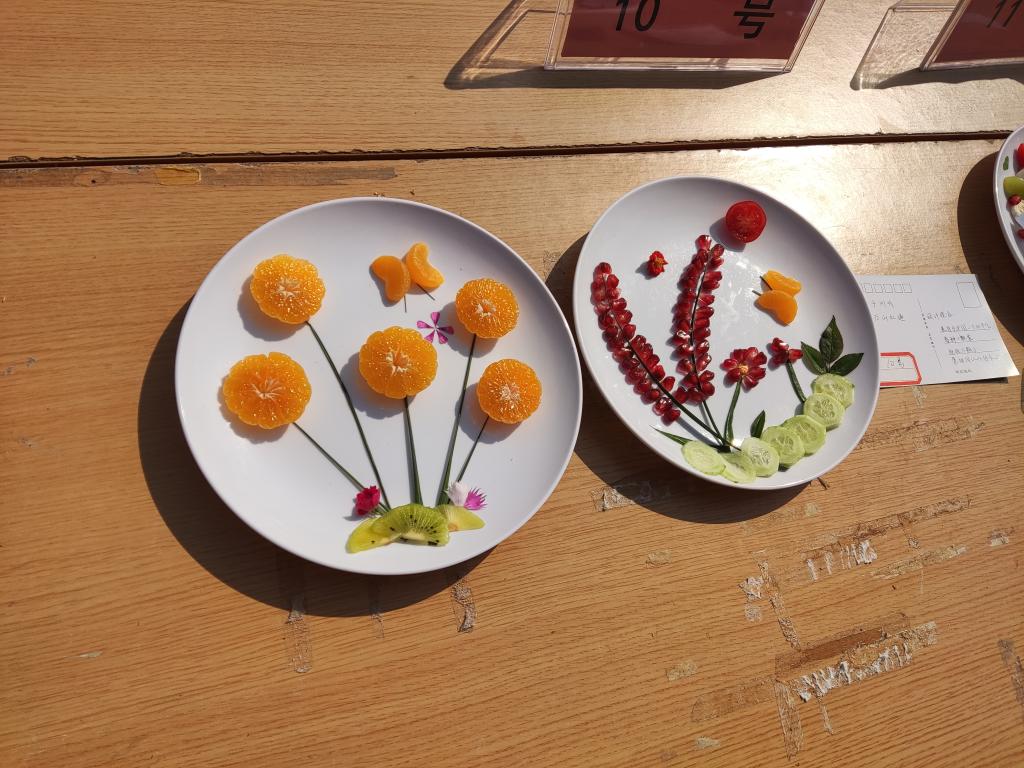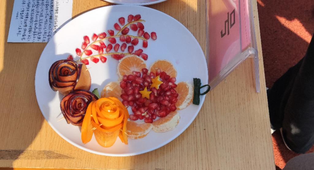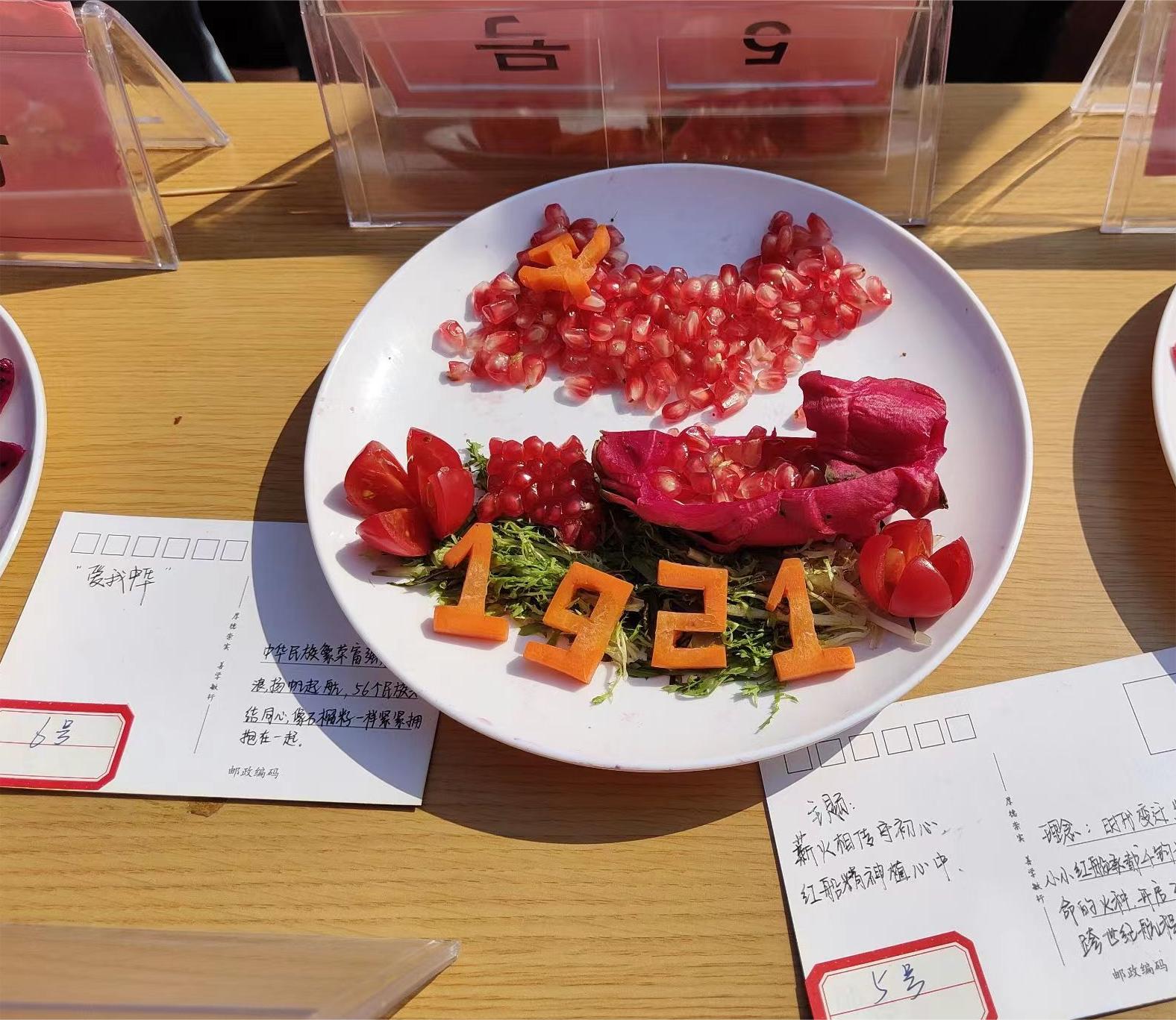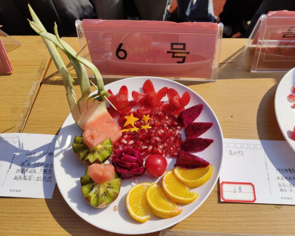 活动开始前参赛选手自由组队,每队四人,活动开始后每队选手充分发挥动手创新能力,分工明确,互相配合,水果削皮、切块、雕刻......同时对其进行拼盘,成品在同学们的手下逐渐成形。完成后各队向评委展示作品、讲解设计理念,作品“红船精神”100多年前,一艘画舫,承载着缔造中国共产党的使命,点燃了中国革命的火种,水果拼盘的红船,代表着中国共产党人不忘初心,筑梦新时代、启航新征程;“红星照耀中国”寓意我们会一直在五星红旗的指引下,为祖国的繁荣昌盛努力奋斗;“爱我中华”寓意中华民族繁荣富强,乘风破浪,扬帆起航,56个民族像石榴籽一样紧紧团结在一起;“薪火相传守初心 红船精神植心中”表明我们会在红船精神的指引下不忘初心,牢记使命,砥砺前行;“有国才有家”表明了青年一代对家的眷恋,对祖国的热爱等。活动评选出一等奖一队,二等奖两队,三等奖三队,优秀奖五队,并为获奖队伍发放奖品。