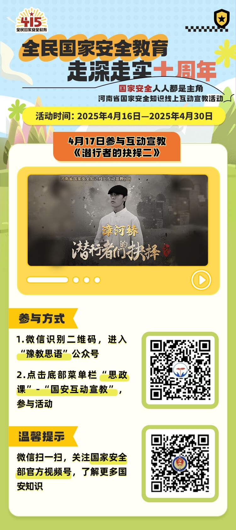 维护国家安全是我们每个人应尽的义务和责任,国家安全,人人都是主角!作为新时代老员工,牢固树立总体国家安全观,提升维护国家安全的意识十分重要且必要,河南省全省师生国家安全知识线上互动宣教活动是今年春季学期一项重要内容。活动于4月16日——4月30日开展,每天更新一部新互动视频,请大家积极参与并将活动截图发送至365英国上市公司团委邮箱15138987665@163.com。互动宣教活动参与方式如下: