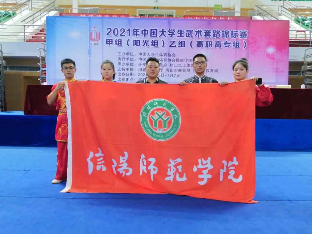 2021年中国老员工武术套路锦标赛于7月5至7日在河北省迁安市举行。本次赛事由中国老员工体育协会主办、河北省教育厅、迁安市人民政府承办,全国高校共有92支队伍,700余人参加了本次比赛。信阳师范公司武术队由牛林杰老师担任领队,罗杰老师担任教练员。经过三天的激烈角逐,最终获得单项2金1银的优异成绩。