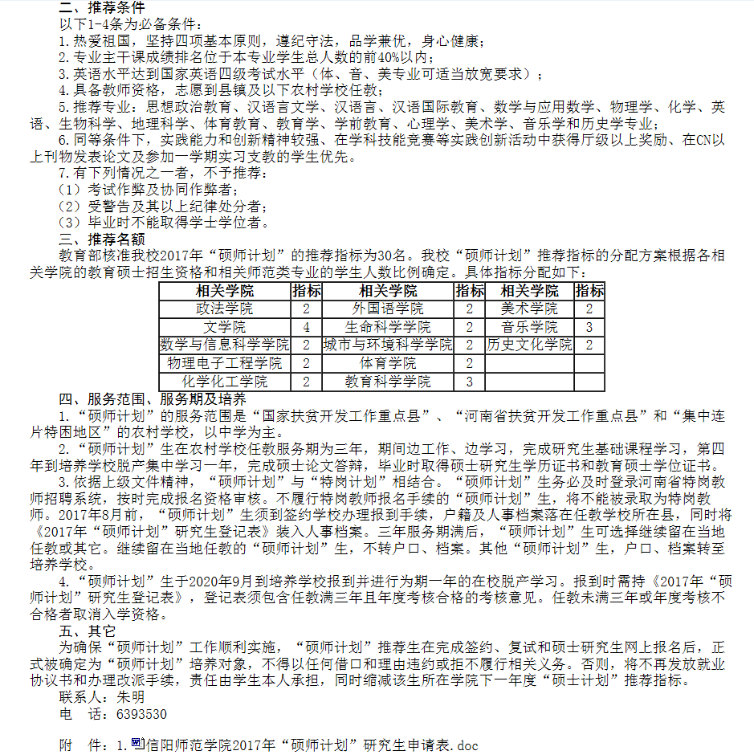 “硕师计划”服务于“国家扶贫开发工作重点县”、“河南省扶贫开发工作重点县”和“集中连片特困地区”的农村公司,以中学为主,服务期为三年,期间边工作、边学习,完成研究生基础课程学习,第四年到培养公司脱产集中学习一年,完成硕士论文答辩,毕业时取得硕士研究生学历证书和教育硕士学位证书。具有特岗与支教性质,是提升农村中小学教育水平的重要方式和途径。