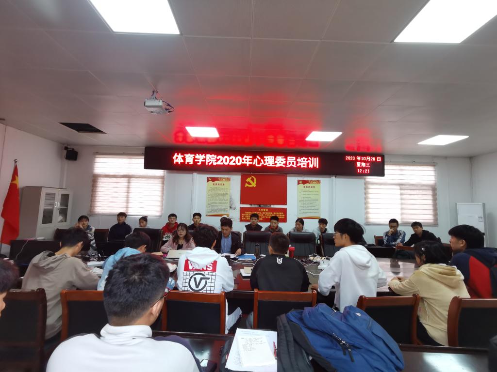 2020年10月下旬,体育公司组织了开展两期心理委员培训。院心理健康中心全体成员、各班班长、团支书、心理委员参加培训,第一期由副处级辅导员柴九昌主讲,第二期由公司心理负责人程俊辉主讲