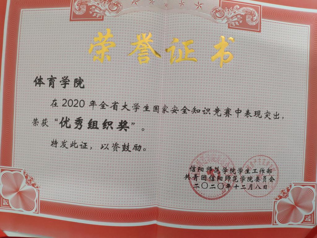 为深入贯彻习近平总书记关于总体国家安全观的重要论述,全面落实中央、省委关于加强国家安全教育有关通知精神和“将国家安全教育纳入国民教育体系”的法定要求,提高青年老员工的国家安全意识,我院严格落实校相关文件要求于10月9日至11月15日期间举办了老员工国家安全知识竞赛活动。竞赛活动得到了公司全体师生的高度重视和积极参与,各年级辅导员、班委广泛宣传、精心组织,参赛选手扎实准备、认真答题,在全院范围内形成了良好的学习氛围。,公司获得优秀组织单位,程俊辉为优秀指导教师。