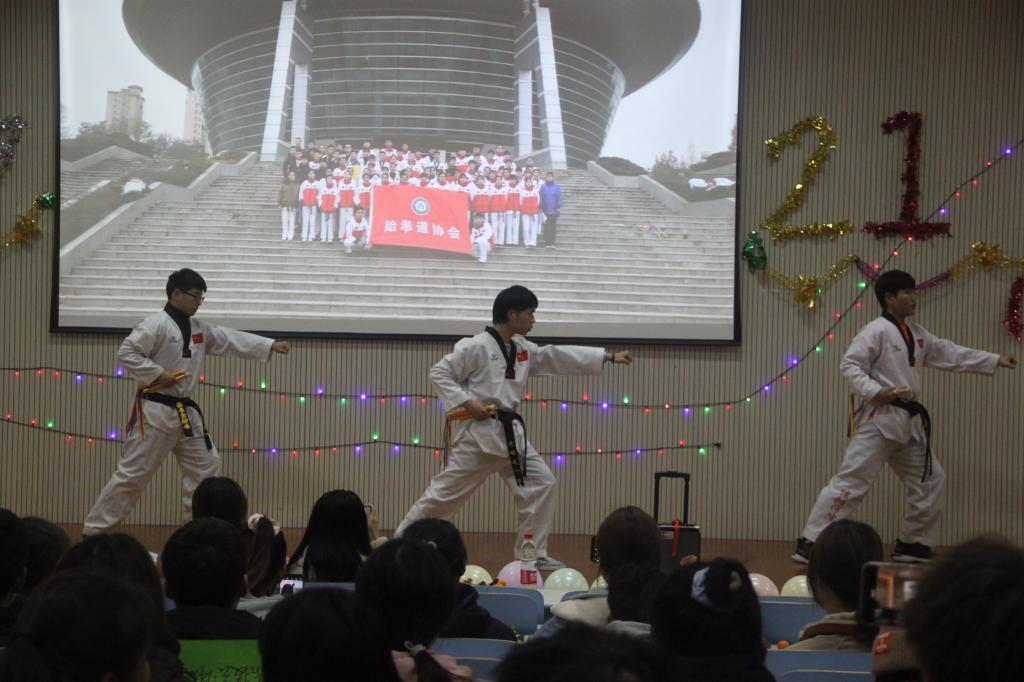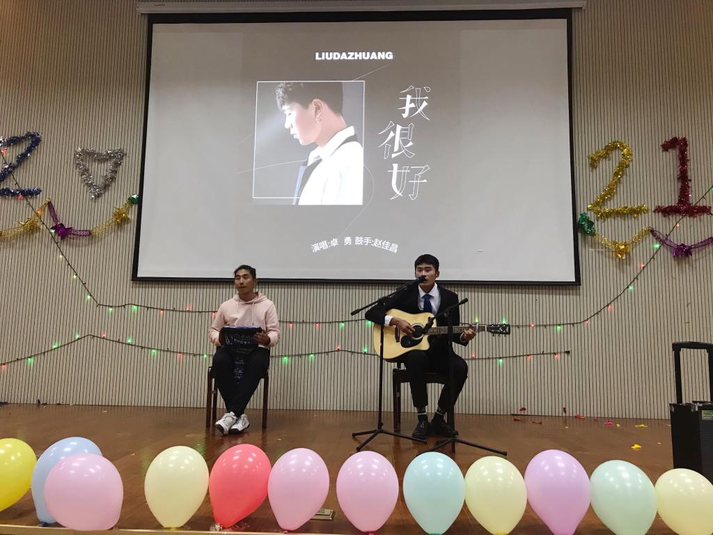 元旦晚会由健美操协会表演的精彩一舞拉开帷幕。一曲《信仰》,让大家感受到来自生命的力量,一曲唱罢,荡气回肠。张碧玉、高毅表演的相声《抗疫之心》,让我们感受到全民抗疫的信心和决心。卓勇吉他弹唱、赵佳昌以非洲鼓伴奏,给大家带了一曲优美动听的歌曲《我很好》。在优美的歌声中穿插游戏使的气氛更加活跃。此次元旦晚会节目精彩纷呈,话剧《祝你幸福》、小品《确认过眼神》笑点密集,给大家带来许多欢乐,一曲《十年》让人沉浸在美妙的旋律中,《跆舞双截棍》、武术表演、独舞《Love potion》让人大饱眼福,同时开启抽奖活动,将气氛带到高潮。一曲《你是人间四月天》结束了本次元旦晚会。