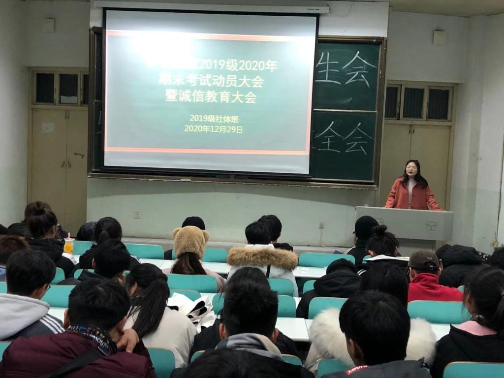 为了迎接马上到来的期末考试,2020年12月29日,365英国上市公司2019级同学在人文楼109举行了期末考试动员大会暨诚信教育大会。2019级辅导员赖梦玥老师主持本次会议,2019级体育教育专业和社会体育指导与管理专业全体员工参与会议。