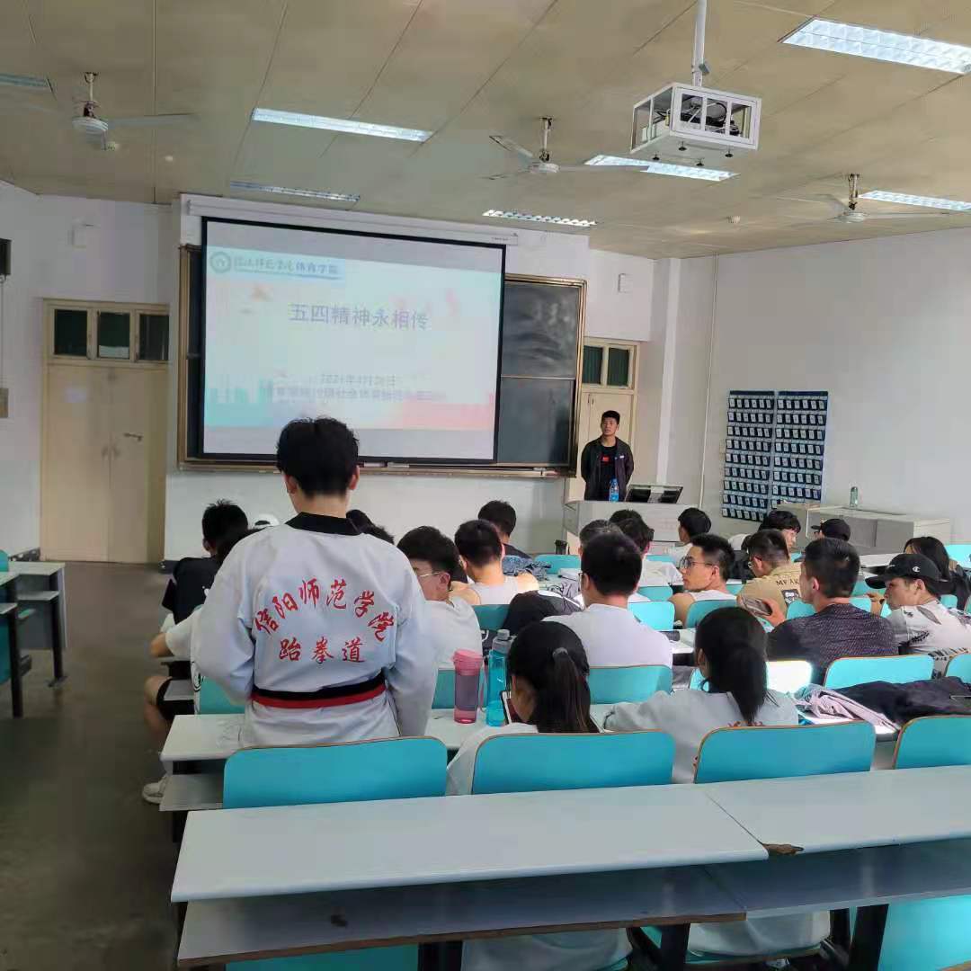 4月26日2019级体育教育一班全体同学在教六楼201举行“传承五四精神,铭记百年党史”主题班会。首先,由团支书许成琳同学讲解百年党史的发展历程和五四精神;接着由班长石成玉组织全体同学齐唱中国人民志愿军战歌。班会期间,同学们认真聆听,这次主题班会同学们收获甚多,要继承老一辈革命者的吃苦耐劳精神和坚忍不拔的奋斗精神,只有这样青年一代才能真正担当得起复兴中华的重任,成为社会的栋梁,国家的希望。29日,2019级体育教育二班全体同学召开了“弘扬五四精神,做时代有为青年”主题团日活动。介绍了五四运动的历史背景,重大事件及历史意义等内容,通过现场的介绍从而使同学们重温历史,又观看了习近平总书记在纪念五四运动100周年上的讲话,最后由李海亮同学演讲了《愿中国的青年只是向上走》,使同学们深受启发,推动同学们积极的、进步的、自由的、创造的意识。这次活动的举办,弘扬和培育了民族精神学习实践科学发展观深入开展社会主义荣辱观教育活动学习先辈的光荣传统培养良好的品德。30日下午2019级社体班全体同学开展了“五四精神永相传”的主题班会,由李弘元同学向同学们讲解了五四运动、孕育了伟大的五四精神。同学们积极发言,展现了当代青年老员工的热情和风采。此次团课的目的让青年一辈更加感到时代的重任。只有吾辈自强才能为五四精神传薪火,把激昂青春献给祖国。同学们积极发言,展现了当代青年老员工的热情和风采。
