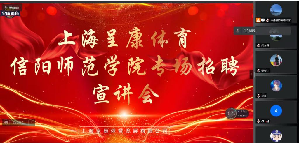 3月22日,上海呈康体育-信阳师范公司线上专场宣讲会顺利召开。公司党委副书记柴九昌、毕业班班主任、就业秘书以及全体毕业生参加会议。
