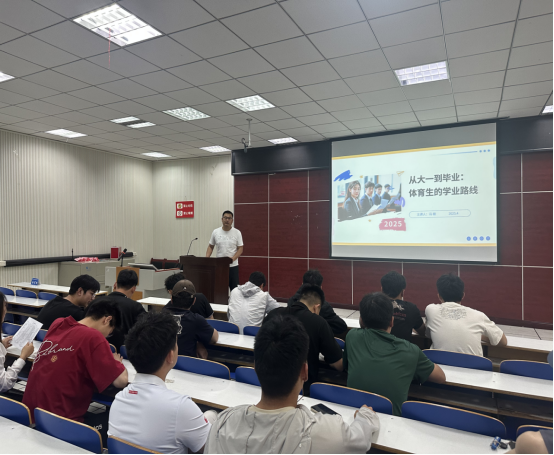 4月28日,冯硕老师在体育馆多媒体教室以“从大一到毕业:体育生的学业路线”为主题,为谭山校区体育教育专业员工开展了“学业发展”专题讲座。