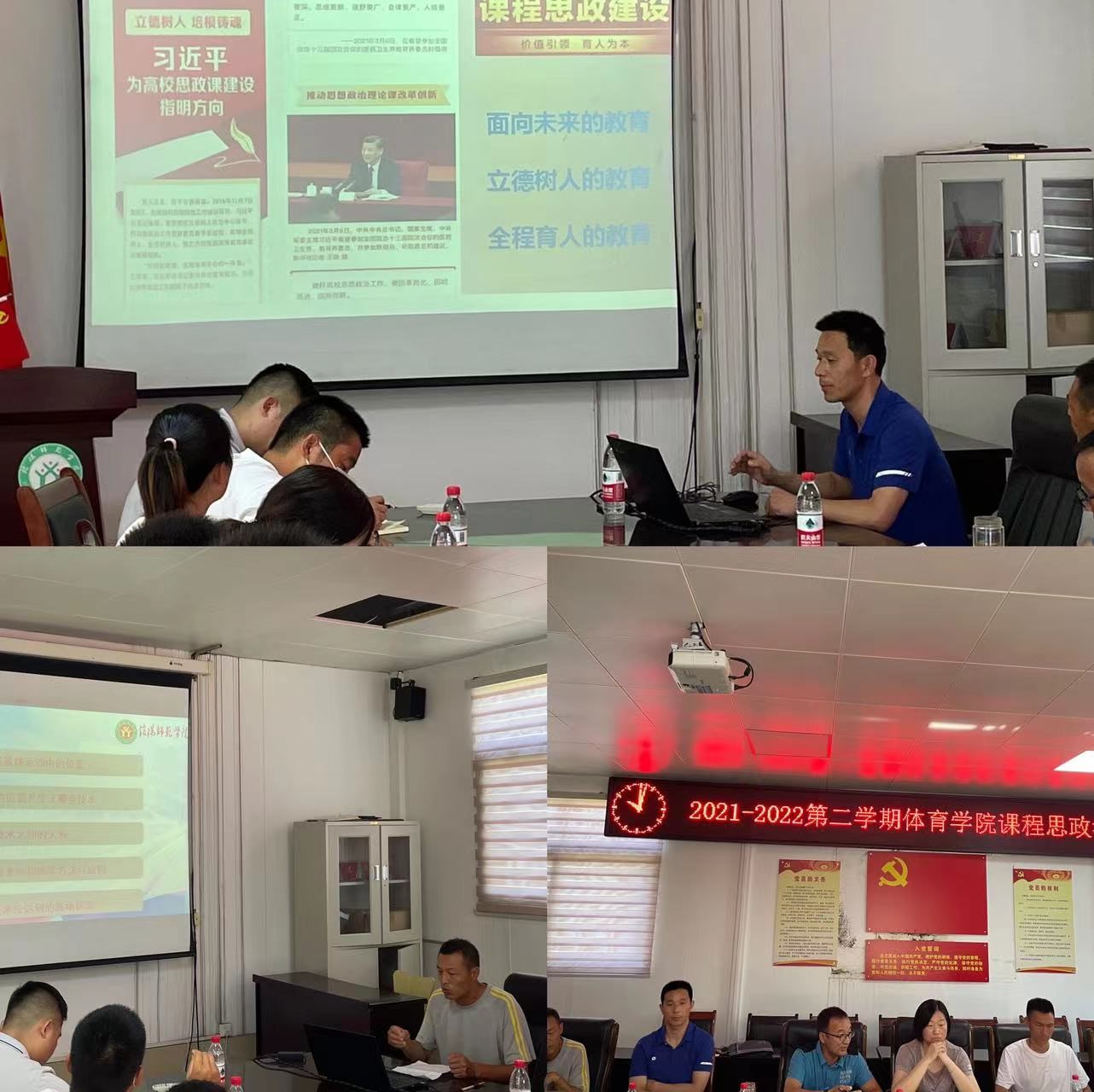 会议邀请了杨明勇老师、张道启老师、曹海波老师进行讲述。首先,杨明勇老师从课程思政的必要性、课程思政如何做以及课程思政如何进入体育课堂等三个方面进行了阐述与交流,重点强调了课程思政的必要性,令人印象深刻;其次,张道启老师则结合自己的课程教学知识,以篮球运动作为切入点代入主题,从什么是篮球运动中的位置、不同的位置产生了哪些技术以及位置技术之间的关系等五个方面跟各位老师做了交流;最后,曹海波老师以自身多年的教学经验和年经的教师进行了交流,年轻教师们反应热烈。