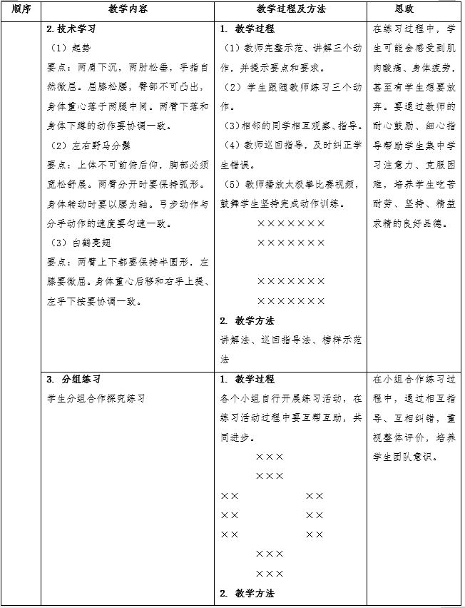 本案例选自公司《太极拳、剑》课程中二十四式太极拳的理论概述和第1-3式的技术学习,包括理论学习和技术学习两个部分。其中理论部分重点学习太极拳运动的价值、起源、发展、流派、运动特点和分类、及健身作用等,技术部分重在使员工掌握二十四式太极拳的1-3式,熟悉动作要领,能够独立完整地做出三个动作。通过案例教学,旨在培养员工尊师重道、家国情怀、文化自信、顽强拼搏、团结协作、责任意识等道德品质,是思想政治教育的优秀载体,具有以下几点优势: