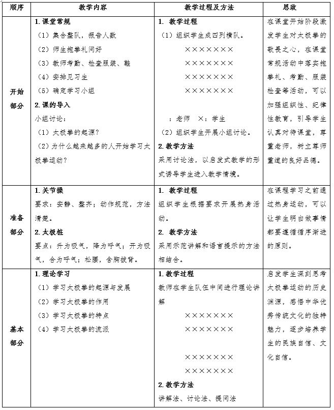 案例教学围绕“传统文化”展开,在教学模式中,首先通过讨论的形式导入太极拳运动,调动员工学习的积极性;通过理论讲授的形式帮助员工学习了解太极拳这一中国优秀传统文化的价值、发展等,让员工感悟中华优秀传统文化的独特魅力,培养员工的民族自豪感、民族自信心;通过动作讲授的形式让员工亲身实践,在实践中领悟太极拳运动的不易,必须坚持不懈才能练好拳;通过小组练习的形式让员工之间互帮互助,互相指出对方存在的问题,更快更高质量地完成动作学习,培养员工的团队精神;通过小组展示激发员工的责任感意识,获得思想品德上的提高;通过课堂作业中对学员太极拳运动的调研,培养员工终身体育的价值理念,鼓励员工热爱太极拳运动,争做太极拳运动的传承者、保护者。